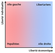 Le libéralisme libertarien semble échapper à la dichotomie politique classique gauche/droite de par ses thèses qui le situent à la fois à gauche au plan des libertés individuelles (dépénalisation des drogues, liberté d'expression, liberté d'immigration, liberté sexuelle, refus de la... ) ainsi qu'à droite au plan des libertés économiques (respect de la propriété privée, liberté d'entreprendre, libre-échange, réduction drastique de la fiscalité, rejet des politiques étatiques de redistribution... ).